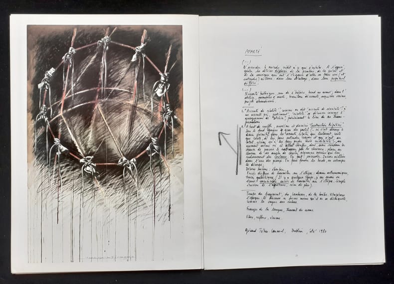 Paris, Maeght éditeur, 1980. In-folio (380 x 280 mm) en feuilles, 32 pages + couverture illustrée, chemise et étui cartonnés recouvert de papier tabac portant une étiquette titrée contrecollée sur le premier plat. 1 DES 150 EXEMPLAIRES SUR VÉLIN COUCHÉ SIGNÉ PAR L'ARTISTE. 19 reproductions dont 9 en couleurs et 1 en double page. Texte de Alain Robbe-Grillet et note technique de Hans Spinner. Carton d'invitation illustré pour le vernissage joint.