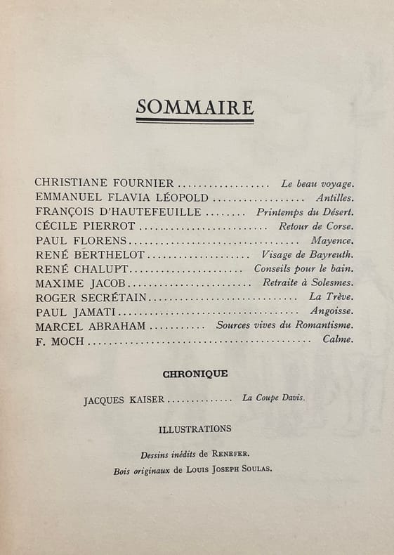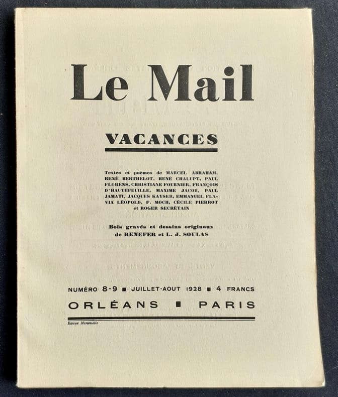 Orléans - Paris : Fédération des Artistes Orléanais, directeurs: Marcel Abraham et Roger Secrétain. Un volume broché (23,5x18,5 cm), 63 pages. En frontispice, bois gravé et dessins originaux de Renefer et Louis Joseph Soulas. Bon état.