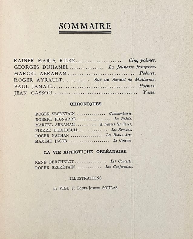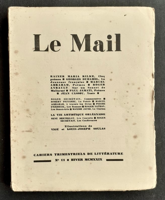 Orléans - Paris : Fédération des Artistes Orléanais, directeurs: Marcel Abraham et Roger Secrétain. Un volume broché (23,5x18,5 cm), 88 pages. Illustrations de Vige et Louis Joseph Soulas. Contient 5 poèmes de Rainer Maria Rilke traduits par Roger Ayrault. Manque 1 cm du dos et rousseurs sur la couverture, intérieur en bon état.