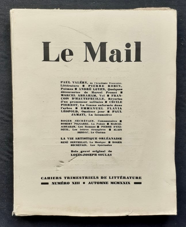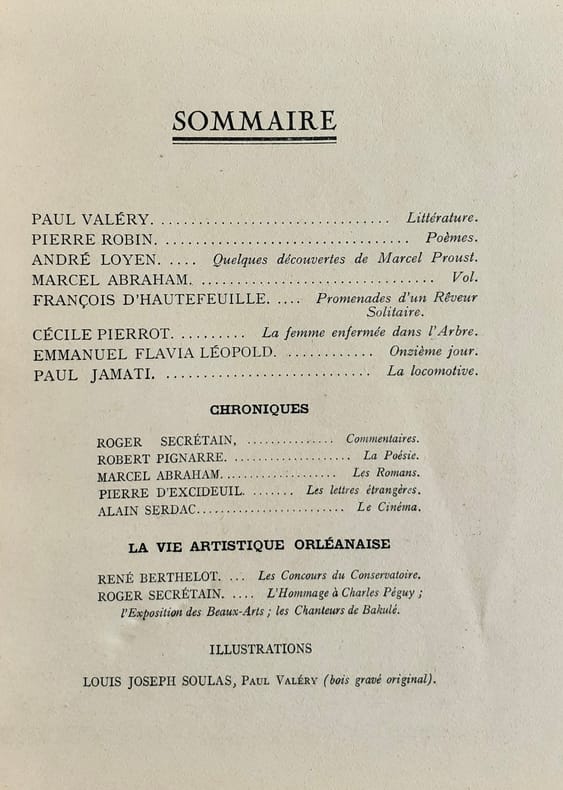 Orléans - Paris : Fédération des Artistes Orléanais, directeurs: Marcel Abraham et Roger Secrétain. Un volume broché (23,5x18,5 cm), 84 pages. En frontispice, bois gravé original de Louis-Joseph Soulas. Bon état.