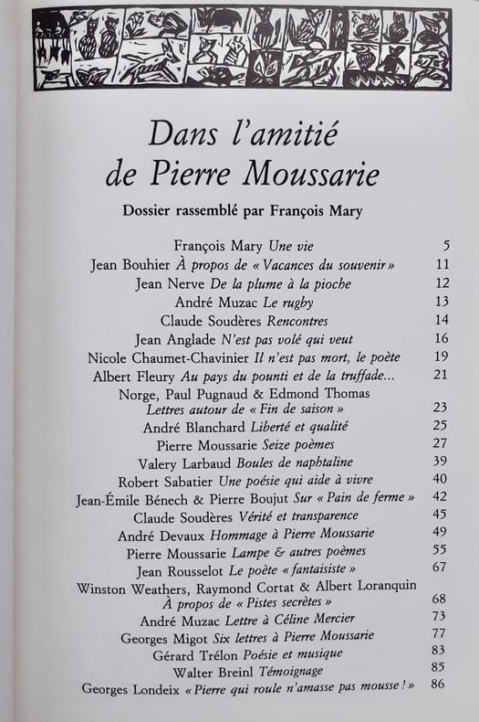 Bassac : Plein Chant, 1994. Directeurs : Georges Monti et Edmond Thomas. Un volume broché sous couverture illustrée, 96 pages. Avec des bandeaux et vignettes de Jean-Pierre Thomas. Dossier consacré à Pierre Moussarie rassemblé par François Mary. Bon état.
