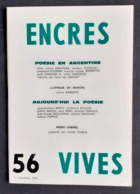 Toulouse : Editions Encres vive, directeur : Michel Cosem. Plaquette agrafée (22,5x15,8 cm), 16 pages. Dossier "Poésie en argentine" avec les traductions d'Henri de Lescoet. Bon état.