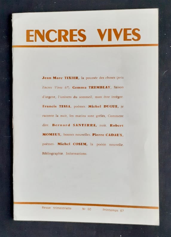 Fondée par Michel Cosem en 1960, Encres vives est aujourd'hui encore une revue mensuelle et une maison d'édition. Tous nos livres sont visibles sur notre site : https://www.livrepoesie.com/