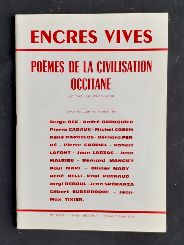 Toulouse : Editions Encres vive, directeur : Michel Cosem. Plaquette agrafée (22,5x15,8 cm), 32 pages. Numéro spécial : Poèmes de la civilisation occitane présentés par Michel Cosem. Textes français et occitan. Bon état.