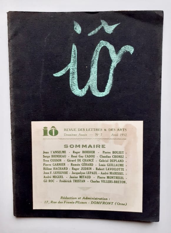 Bonne revue de poésie animée par André Marissel et André Miguel, Io comptera 21 numéros en 18 livraisons parues entre 1951 et 1957. Tous nos livres sont visibles sur notre site : https://www.livrepoesie.com/