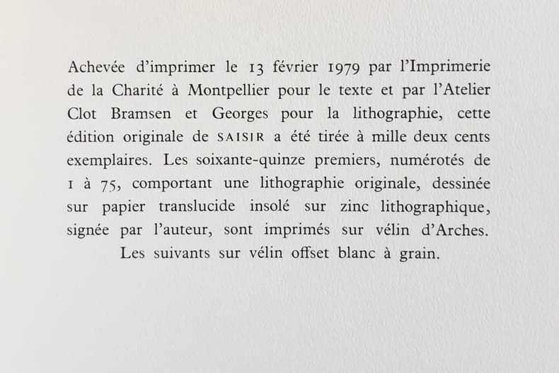 Saint-Clément de Rivière : Editions Fata Morgana, 1979 - un volume broché (25,3x18cm) sous couverture rempliée et illustrée, non paginé. Le texte est ponctué de planches hors texte en noir- édition originale tirée à 1200 exemplaires : 1/1125 sur vélin offset blanc à grains - exemplaire en bon état.