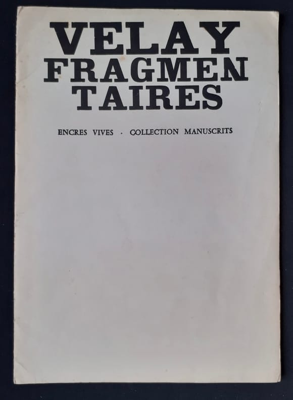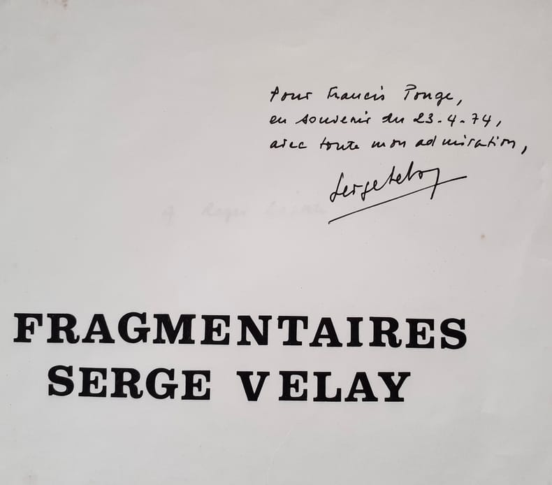 Castillon-en-Couserans : Encres vives (Collection "Manuscrits"), 1974 - une chemise (22x30,5cm) imprimée et 16 feuillets ronéotés recto - Edition originale limitée à 60 exemplaires numérotés (N°7) - bon état - Exemplaire enrichi d'un envoi autographe signé de Serge Velay adressé à Francis Ponge.