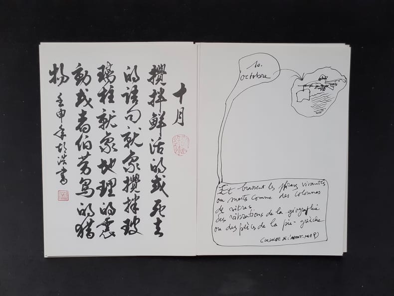 Sans lieu : Jean-Claude Chevrot, 1994. Un volume 23x16,3cm sous chemise imprimée. 32 pages en deux tons : fac-similé du manuscrit de Matthieu Messagier, transposé en mandarin par Huang Xiyun et calligraphié par Hu Hao. Edition originale tirée à 1021 exemplaires : 1/950 sur papier couché. Bon état.
