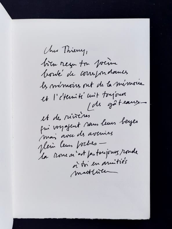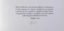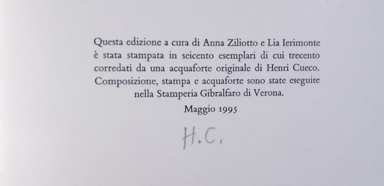 TRaduzione di Piera Benedetti. Postfazione di Alberto Tomiolo. Verona : Edizioni Festina lente, 1995. Un volume 24,8x17,2cm sous jaquette rempliée en vélin imprimé et illustré, 50 pages sur beau papier, avec un bel envoi autographe signé de Matthieu Messagier. Edition originale bilingue français et italien tirée à 600 exemplaires.