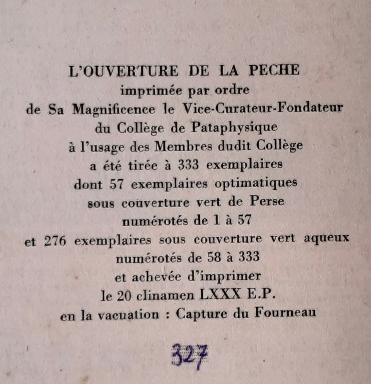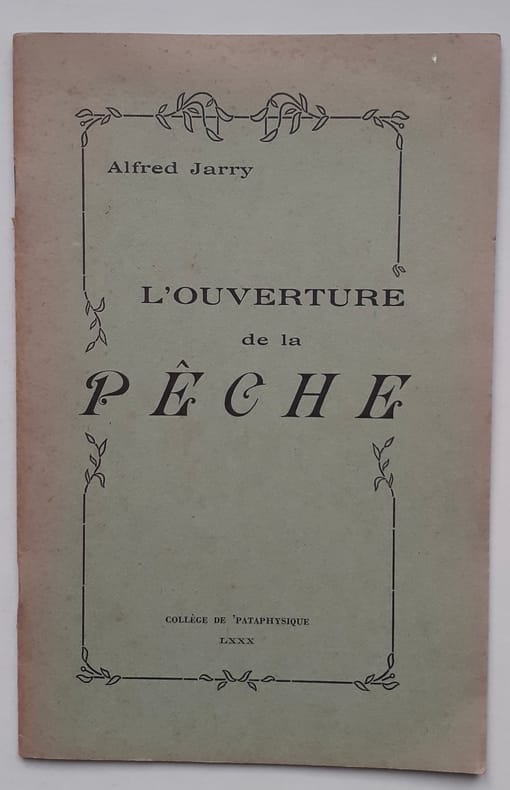 Alfred Jarry, L’ouverture de la pêche, Collège de Pataphysique 80 EP ( 1953 ), plaquette de 14 pages agrafées, 1 / 276 exemplaires sous couverture vert aqueux ( légèrement insolée sur les bords ). Bon exemplaire.