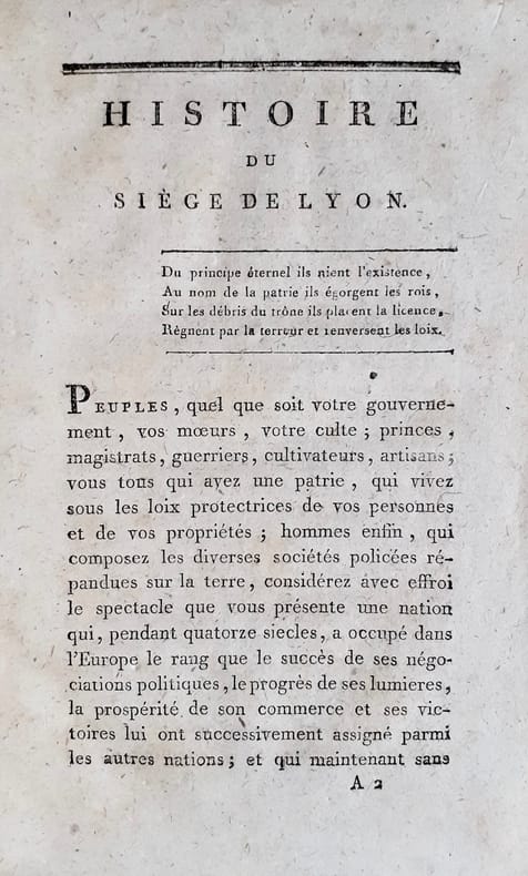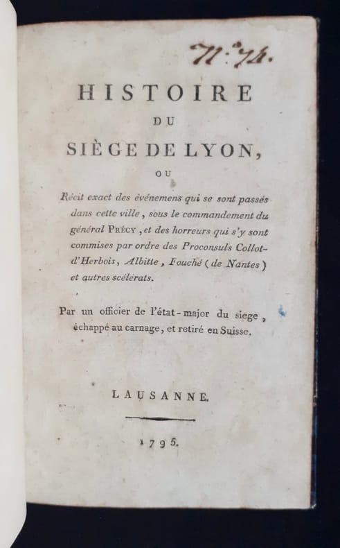 Paul-Emilien Béraud (1751-1836), avocat, membre de l'Académie de Lyon a écrit en 1794, Relation du siège de Lyon, contenant le détail de ce qui s’est passé d’après les ordres et sous les yeux des représentants du peuple français, (Neuchâtel, 1794). Notre exemplaire en est une nouvelle édition avec un nouveau titre. Dans une lettre à son neveu Francisque Bréghot du Lut, Béraud indique : « À l’époque des premiers événements révolutionnaires, sa majesté Louis m’a institué juge au tribunal de la campagne de Lyon. Lors du procès du roi, on me fit tenir à Lyon un paquet assez considérable du plaidoyer de M. de Sèze et des dernières paroles du roi à l’infernale Assemblée qui l’a assassiné le 21 janvier. […] Je distribuai pendant la nuit les plaidoyers et autres écrits, dans les quartiers, aux portes de la ville et dans toutes les places. Les officiers municipaux, d’abord Bertrand, Chalier et consorts déchainèrent dès la pointe du jour tous leurs sbires […] ; j’échappai à leurs poursuites. Depuis, pendant le siège de Lyon, j’ai été officier civil et militaire, ma femme est périe à la sortie ; mon fils, blessé à mes côtés, a été fait prisonnier avec moi, à cette même sortie commandée par M. le lieutenant général de Précy. J’ai échappé à la mort par un prodige [échappé de sa prison de l’Hôtel-de-Ville, dit-on, sous les habits de sa maîtresse venue le visiter]. J’ai émigré en Suisse [Neufchâtel], où j’ai composé la relation du siège de Lyon en 4 époques et un ouvrage que M. l’Avoyer de Berne a fait traduire et imprimer à Bâle, ce qui m’a valu aide et protection jusqu’à mon retour à Lyon après le 9 thermidor » (Michel Dürr, Dictionnaire historique des académiciens de Lyon). Tous nos livres sont visibles sur notre site : https://www.livrepoesie.com/