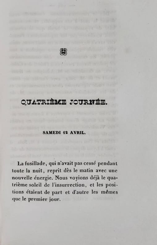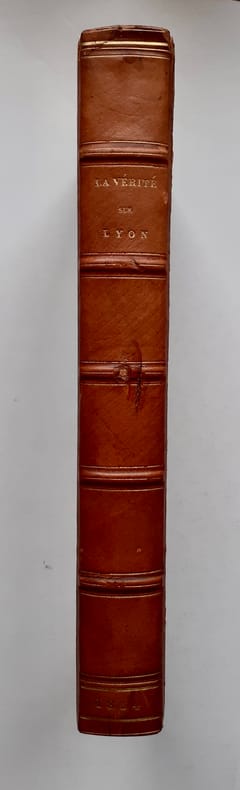 Relation des six journées de la seconde révolte des Canuts à Lyon du mercredi 9 au lundi 14 avril 1834 avec de nombreux documents et témoignages. Selon la Bibliothèque nationale ce livre est attibué à Léon Genton, Allerat et Louis Greppo, celui-ci canut, proche des néo babouvistes, représentant démocrate socialiste du Rhône pendant la Deuxième République. Sur notre exemplaire, il est mentionné d'une écriture ancienne en page de garde : "Par M. Paul Allut" (Paul Allut, historien lyonnais, 1794-1880). Tous nos livres sont visibles sur notre site : https://www.livrepoesie.com/