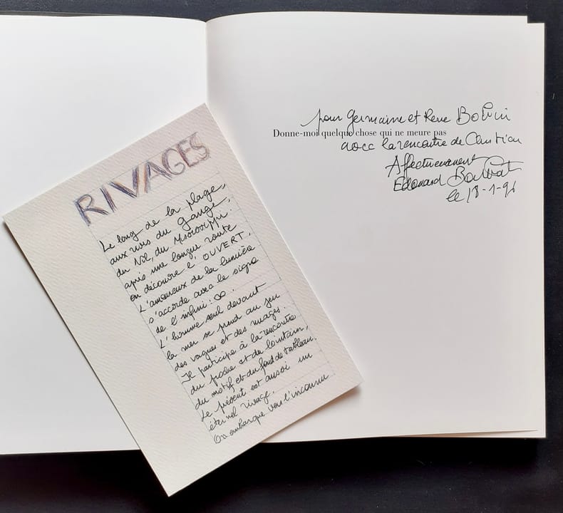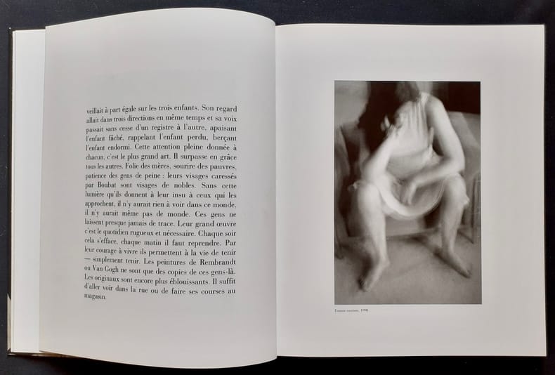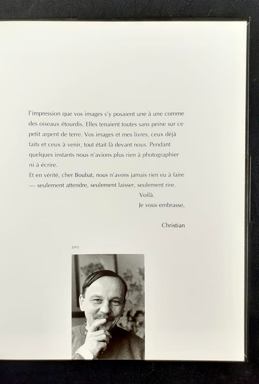 Paris: Éditions Gallimard, décembre 1995. Un volume broché (23x28,5 cm), (112) pages dont 70 photographies en pleine page d’Édouard Boubat. Texte de Christian Bobin. Édition originale sur papier courant (pas de grand papier annoncé) avec un envoi autographe signé d’Édouard Boubat aux parents de Christian Bobin, Germaine et René. Bon état.