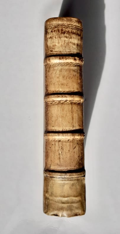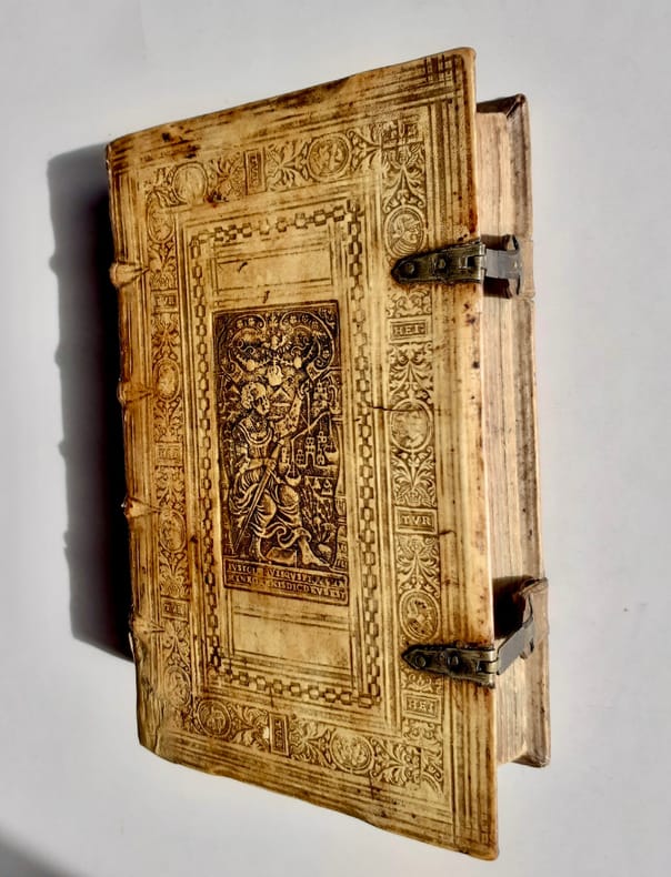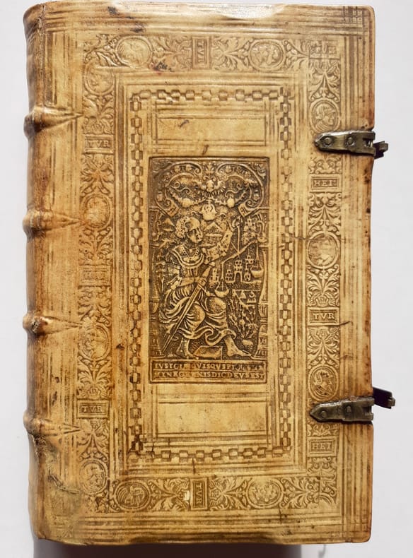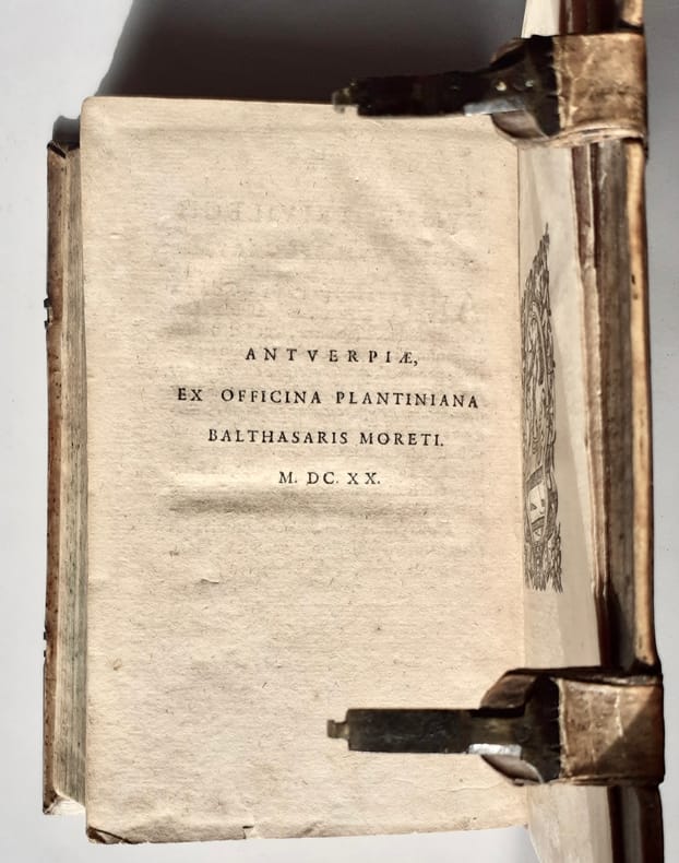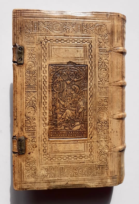 Anvers: Officina Plantiniana, chez Balthasar Moretus, 1620. Édition originale. In-8 peau de truie sur ais de bois biseautées estampé à froid avec encadrements de filets et roulettes végétales ornées de deux portraits en médaillons avec les monogrammes HEI et TUR, chacun répété. Plaques centrales frappées en tons sombres, différentes sur chaque plat représentant la Justice et la Fortune avec devise latine en cartouche. Dos à quatre nerfs et fermoirs. Titre illustré, 7 et 15 pages, 541 pages, index des livres et des chapitres. Au colophon, marque des Plantin avec sa devise. Caisson en pied du dos restauré. Reliure allemande monastique avec en troisième de couverture la cote du livre dans la bibliothèque à la date de 1620, manuscrite d’une écriture ancienne.