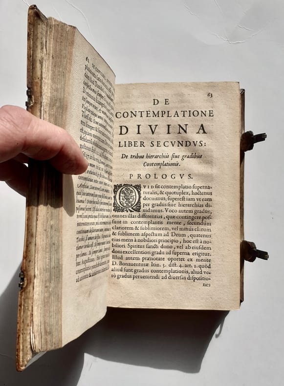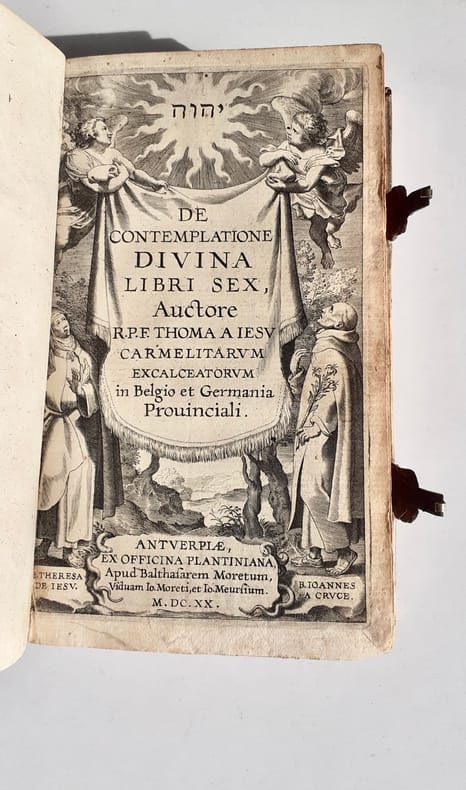 Thomas de Jésus (1564-1627), carme espagnol fondateur de «déserts» en Europe, fervent disciple de Thérèse d’Avila (représentée en frontispice avec Jean de La Croix). Il écrit ce traité de mystique pendant ses treize années de séjour en Flandres (1610-1623). Belle reliure avec son décor poussé à froid bien lisibles, notamment les deux fines allégories centrales colorées d’un ton plus foncé. Tous nos livres sont visibles sur notre site : https://www.livrepoesie.com/