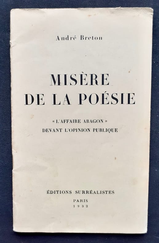 Édition originale À la suite de la publication de son poème "Front rouge" dans l'édition française de la revue "Littérature de la Révolution mondiale" (Moscou, n° 1,1er juillet 1931), puis dans le recueil "Persécuté persécuteur", Aragon est inculpé en novembre d'incitation de militaires à la désobéissance et de provocation au meurtre. André Breton rédige un tract, « L'Affaire Aragon » qui recueille plus de 300 signatures, pour défendre linculpé. L'Humanité désavoue cependant le poème d'Aragon. Breton écrit alors le texte « Misère de la poésie », pour revendiquer l'autonomie de la poésie. Cependant, Aragon ne se reconnaît pas dans le texte de Breton et signifie ainsi sa rupture avec Breton et les surréalistes dans L'Humanité du 10 mars 1932. « Misère de la poésie est un texte qui dépasse de loin les circonstances de sa publication. (...) Elles conduisent Breton à définir avec une grande rigueur la position surréaliste quant aux relations de l'expression lyrique avec la société. L'analyse théorique de Misère de la poésie apparaît ainsi comme une préface aux Vases communicants (1932) et aussi à Position politique du Surréalisme (1935). Il s'agit là certainement du texte de Breton le plus méconnu. » (notice des Tracts de José Pierre, p. 459 sqs) [Gilles Mioni, 2012] cf Gilles Mioni, site André Breton, 2011