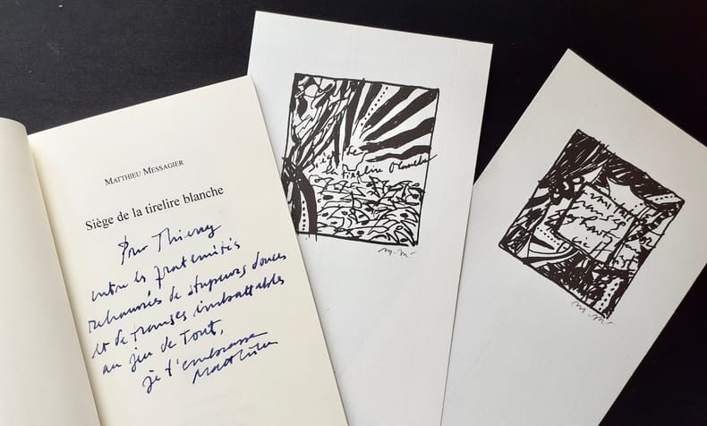 Editions L'arachnoïde & Le renard pâle, 2005. Un volume broché (21x12,2 cm), 58 pages. Edition originale limité à 550 exemplaires : exemplaire sur papier vergé contenant 3 idéographes signés de l'auteur avec un bel envoi autographe signé de Matthieu Messagier. Bon état.