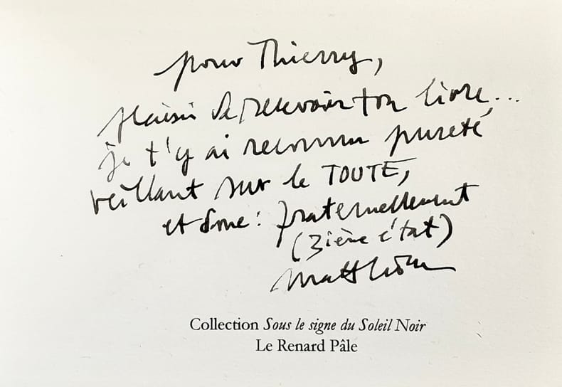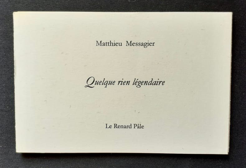 Editions Le Renard Pâle (Collection "Sous le signe du Soleil Noir"), 2007. Un volume en feuilles (12x18 cm), (16) pages. Edition originale tirée sur Papier poussière de Lune : 1/12 exemplaires d'auteur numérotés et signés par Matthieu Messagier avec un bel envoi autographe. Bon état.