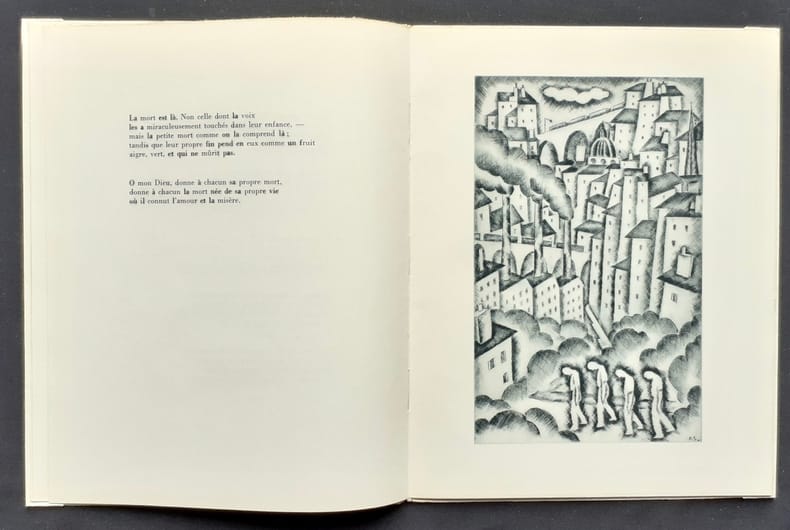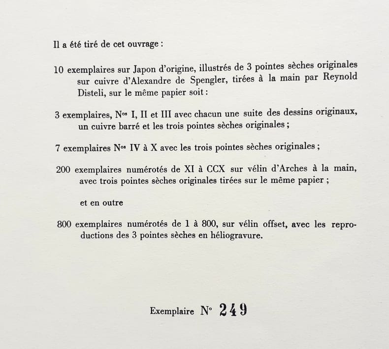 Traduction d'Arthur Adamov et Marie Geringer. Lausanne : Editions Bonnard, 1947. Un volume broché sous couverture rempliée (28x22,5 cm), 36 pages. Edition originale de traduction tirée à 1020 exemplaires : 1/800 sur vélin illustré de 3 pointes sèches d'Alexandre Spengler reproduites en héliogravure. Bon état.