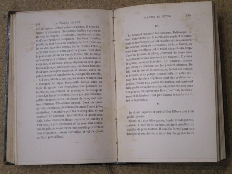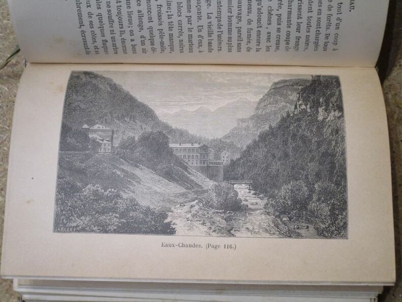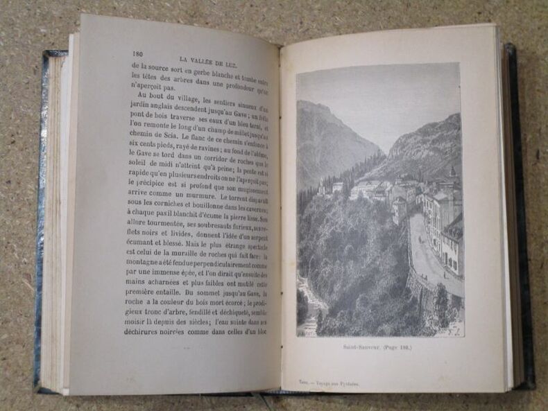 MB. Edition Hachette 1860, illustrations en noir /blanc dans le texte et hors texte, demi-chagrin violet foncé, dos orné à nerfs, filet d'encadrement sur les plats (reliure de l'époque). Les 3 Tranches sont dorées. Édition définitive en partie originale, illustrée de 341 vignettes sur bois de Gustave Doré, dans le texte et hors texte.L'édition originale a paru en 1855 sous le titre Voyage aux eaux des Pyrénées, augmentée en 1858 de nombreuses pages plus personnelles de récits de voyage de l'auteur. La troisième édition. La troisième édition, la première au format in-8, est illustrée de 332 bois inédits dont une cinquantaine à pleine page comprise dans la pagination. Coins du premier plat abimes, interieur tres bon, photos possibles