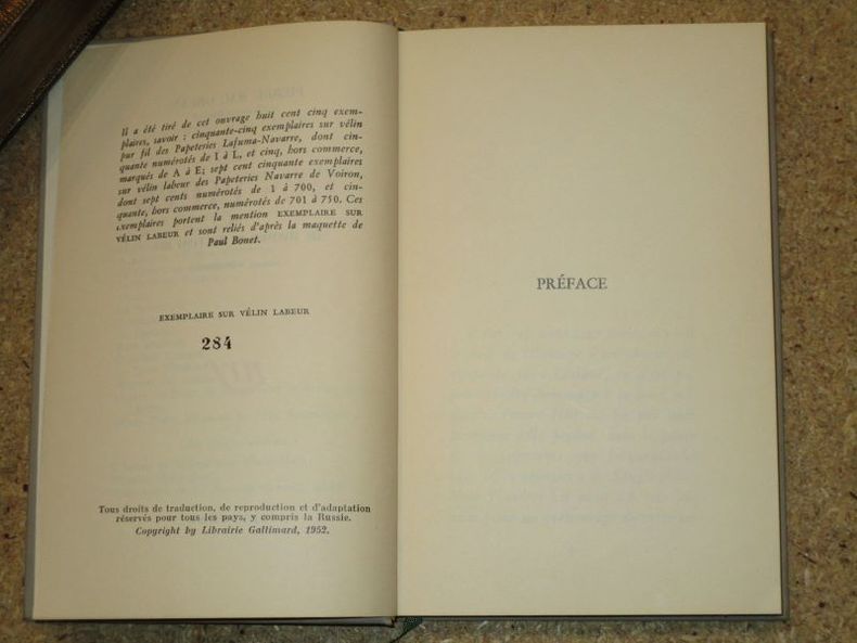 Gallimard 1952 Gallimard, 1952, 212 p., relié d'après la maquette Paul Bonet (cartonnage Bonet), environ 180x115mm, exemplaire numéroté 284 sur vélin Labeur, cartonnage un peu insolé et sali, bon état pour le reste et intérieur bien propre.