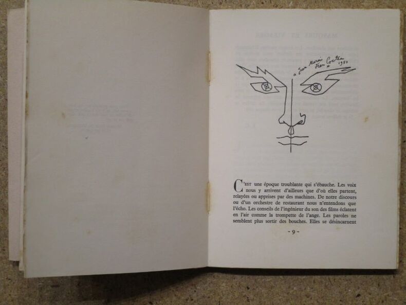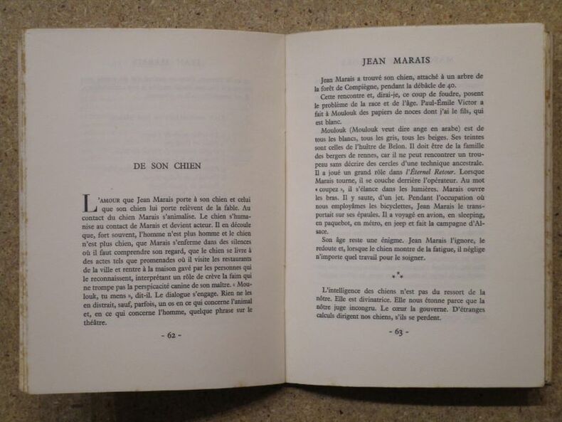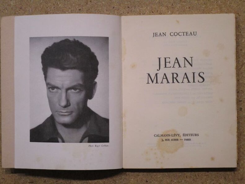 Édition originale sur alfama du Marais, seul tirage sur beau papier, un des 24 exemplaires hors commerce. Elle est ornée, en frontispice, d’une photographie de Jean Marais par Roger Corbeau, avec jaquette et gravure en-tête de la main de Jean Cocteau. Le premier plat de couverture a également été dessiné par Cocteau. Cet essai rend successivement hommage à l’acteur, un de ceux, selon Cocteau, “qui contredisent leParadoxede Diderot” et au peintre avec qui Cocteau fut lié indéfectiblement de 1938 à 1963. Des «notes» de comédien de Marais sont insérées ainsi que des extraits de lettres, produisant un portrait vivant. L’ouvrage qui se veut aussi un ouvrage critique présente in-fine un catalogue des films dans lesquels Marais a joué et un catalogue de ses œuvres picturales. Exemplaire de présent, enrichi d’un émouvant envoi de l’auteur à Jean Marais: “Mon Jeannot je ne te donnerai jamais assez en échange de ce que tu me donnes. Je t’embrasse. Jean * Cap Santo Sospir. Mars 1951”. C’est en 1937 que Jean Cocteau fit la connaissance de Jean Marais, lors d’une audition pour sa pièce Œdipe-Roi. Il est ébloui par l'acteur, au profil identique à celui d'Éphèbe, que Cocteau dessine sans cesse. “Je ne l'ai pas connu, je l'ai reconnu”, dira-t-il plus tard. Depuis cette rencontre, qui lança la carrière du jeune homme, Jean Marais devint l’amant puis le grand ami de Cocteau, jusqu’à sa mort. L’envoi est signé de la célèbre villa de la grande amie et mécène de Cocteau, Francine Weisweiller, à Saint-Jean-Cap-Ferrat que le poète avait découverte l’année précédente et dont il orna les murs de fresques (Georgel). Exceptionnel exemplaire réunissant l’auteur et sa muse, certainement le plus désirable qui soit. Pierre Georgel, Jean Cocteau et son temps 1889-1963, Paris, Musée Jacquemart-André, 1965, p. 139.
