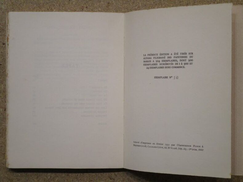 Calmann-Lévy 1951 Calmann-Lévy, Coll. Masques et Visages, 1951,121 p., broché, environ 190x145mm, exemplaire numéroté 10/924 sur Alfama filigrané du Marais. Des rousseurs sur les tranches et sur quelques pages, bon état pour le reste.
