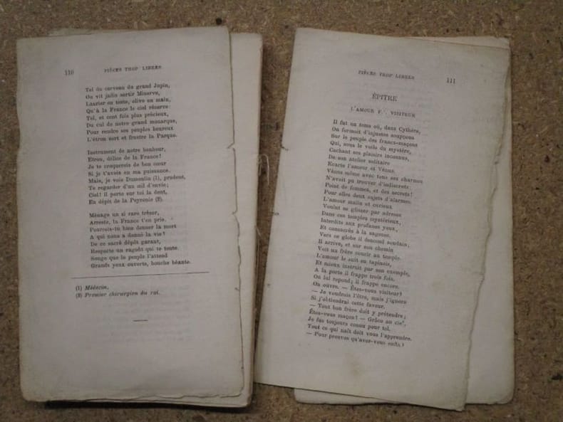 Presses de la société des Bibliophiles Cosmopolites Neuchatel 1874 Imprimé par les presses de la Société des Bibliophiles Cosmopolites à Neuchatel, 1874, édition originale numéroté 111/200 (l'un des 148 petits in-12 sur papier de Hollande), environ 155x905mm, VIII-117 p. La couverture est manquante, les feuillets sont désolidarisés les uns des autres mais il ne manque pas de page. La page de faux-titre est restaurée et fendillée en bordure, les 10 premières pages sont tachées (sans gêne pour la lecture toutefois), quelques rousseurs sur le reste des pages.