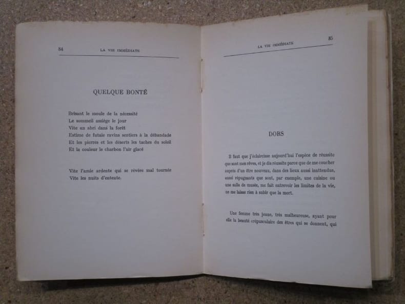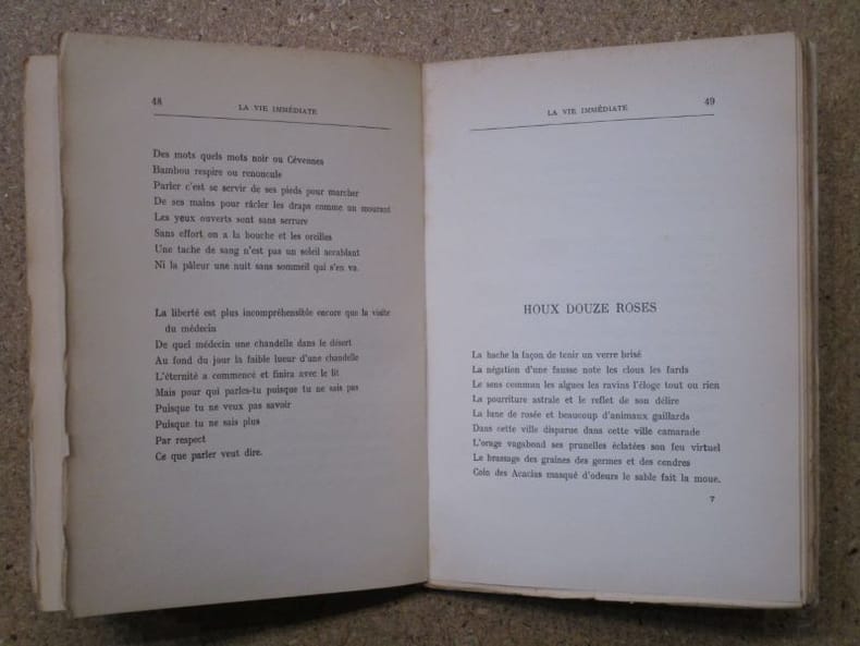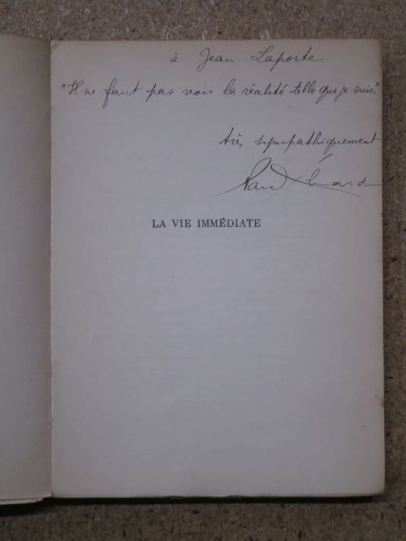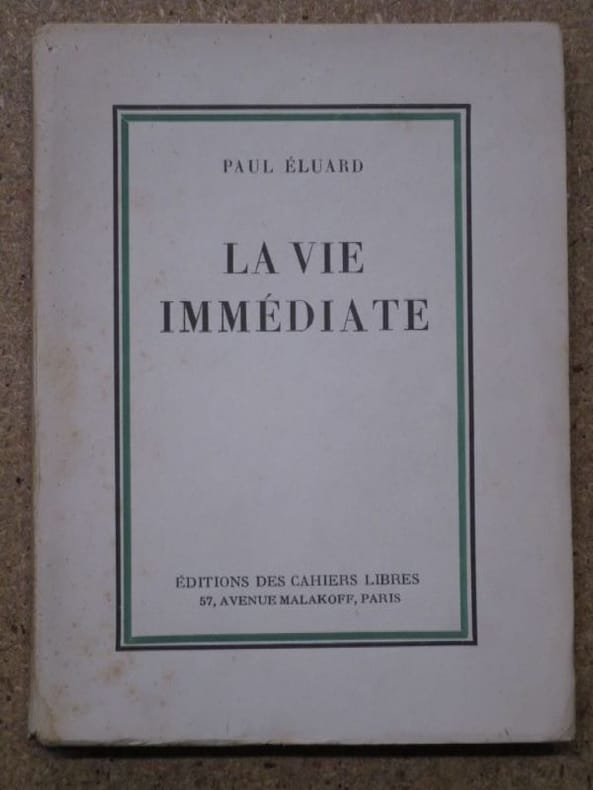 Cahiers Libres 1932 Editions des Cahiers Libres, 25 juin 1932, 170 p., broché, environ 195x145mm. Exemplaire du service de presse avec un envoi d'Eluard. Dos insolé, des rousseurs sur la couverture, une mouillure sur le bas du dos et le bord inférieur des plats, haut et bas du dos un peu émoussés, une déchirure sans manque de 1cm en bordure du second plat, des taches sur les contreplats, bord de quelques pages un peu fendillée. Intérieur bien propre.