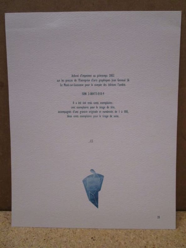 Editions l'amble, 2002 Editions l'amble, 2002, in-folio en feuilles dans une pochette, 28p + 2 illustrations pleine pages et une gravure originale. Tirage à 300 exemplaires, un des 100 premiers contenant une gravure originale (numéroté 18). De légers accrocs et quelques traces sur la pochette, un texte au stylo sur la page de titre sinon les feuilles sont très propres. Bon état général.