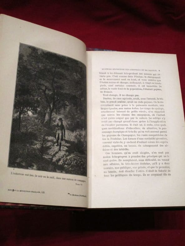 Furne et Cie Paris 1838 Dix volumes in-8, 1838-1839, reliure demi-basane bleu nuit de l'époque, dos lisses ornés d'un riche décor romantique doré, plats et gardes marbrés, tranches marbrées. Septième édition pour les cinq premiers volumes. Sixième édition pour les cinq derniers datés de 1837. 50 gravures sous serpente d'après Scheffer et Raffet, dont 10 portraits en frontispice, carte dépliante de la campagne d'Italie (1796) à la fin du tome X, suivie de la Table des matières alphabétique. Atlas des campagnes de la Révolution Française, dressé par Th. Duvotenay, gravé par Ch. Dyonnet, in-4, reliure demi-chagrin vert sombre de l'époque, dos à quatre nerfs, titres dorés, fleurons dorés, plats de percaline, 32 cartes en double page montées sur onglet. Tome I : XX-395 pp., et 5 gravures. Tome II : (4]-479 pp., et 6 gravures. Tome III : (4]-399 pp. et 5 gravures. Tome IV : (4)-414 pp., et 5 gravures. Tome V : (4)-419 pp., et 8 gravures. Tome VI : (4)-399 pp., et 6 gravures. Tome VII : (4)-391 pp., et 3 gravures. Tome VIII : (4)-437 pp., et 4 gravures. Tome IX : (4)-427 pp., et 3 gravures. Tome X : 452 pp., et 5 gravures. La parution de la première édition s'est échelonnée sous la Restauration de 1823 à 1827. L'ouvrage a été un grand succès de librairie : c'est la première histoire de la Révolution. Notre exemplaire, la septième édition, contient en introduction son discours de réception à l'Académie française (1834), où Thiers déclare «Jai consacré dix années de ma vie à écrire lhistoire de notre immense révolution; je lai écrite sans haine, sans passion, avec un vif amour pour la grandeur de mon pays; et quand cette révolution a triomphé dans ce qu'elle avait de bon, de juste, de durable, je suis venu déposer à vos pieds le tableau que j'avais essayé de tracer de ses longues vicissitudes...» Elégante reliure romantique, quelques frottements sur les plats, abondantes rousseurs, bien complet de l'atlas, cartes en très bon état. Bon ensemble.(VeiB79) PHOTOS NUMERIQUES DISPONIBLES PAR EMAIL SUR SIMPLE DEMANDE-DIGITAL PHOTOGRAPS MAY BE AVAILABLE ON REQUEST