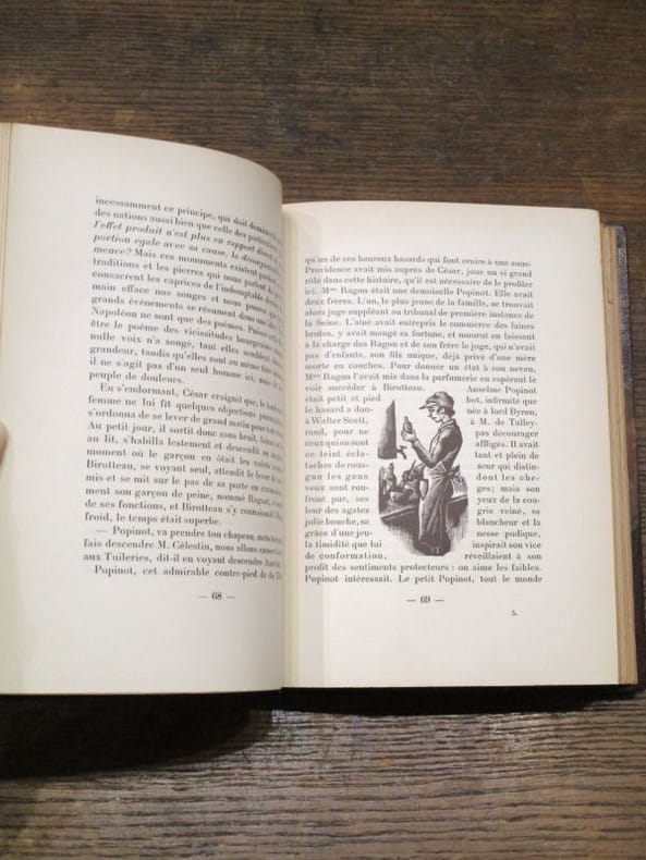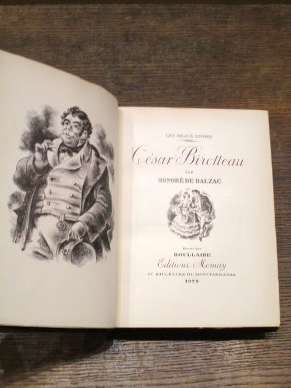 Paris, Aux dépens de la Société Les Bibliophiles du Papier, 1933, in-folio, broché sous couverture rempliée, étui et emboitage à décor de roses, vignette de titre. Etui insolé. Manques de papier au dos de l'emboitage sinon bel exemplaire, très frais. (330x260mm)., 409 pages. 7° volume de la collection des Bibliophiles du Papier. Tirage limité à 110 ex. nominatifs sur Johannot, celui-ci n°8 (M. Porcher). Nombreuses lithographies en noir dans le texte par Lucien Jonas. In fine Notice sur le manuscrit et les épreuves de César Birotteau & Documents divers reproduits en fac-similé : portraits, autographes, épreuves, couvertures. Complet du feuillet libre de 4 pages comprenant le Catalogue des divers produits fabriqués par César Birotteau , du Menu du Dîner en l'honneur de César Birotteau et du Conseils aux Dames ou Essai sur les moyens qu'elles doivent employer pour conserver longtemps leurs attraits . Signatures mauscrites de 24 membres du Club des Bibliophiles sur le dernier feuillet. Complet du courrier annonçant au souscripteur la mise à disposition de son exemplaire sous enveloppe illustrée.