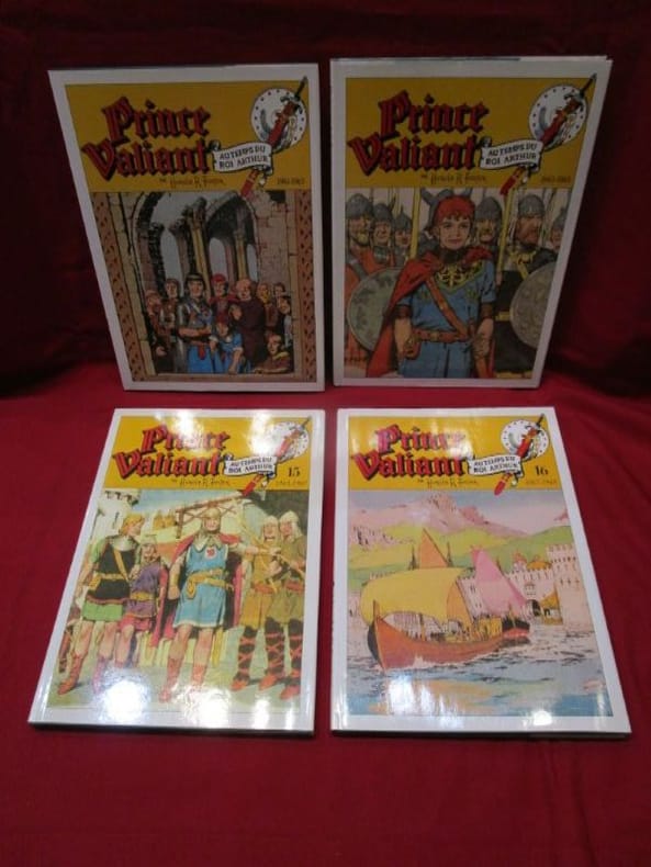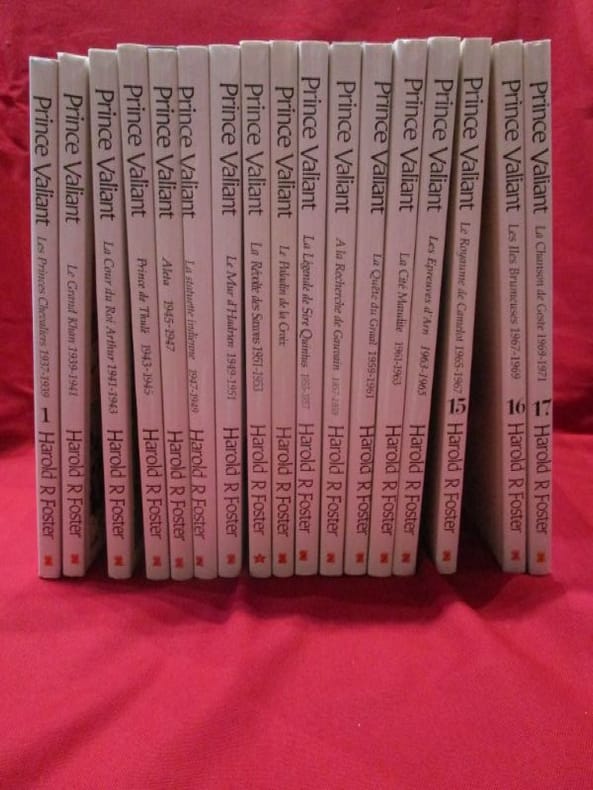 Zenda éditions, DL de 1995 à mars 1997. 17 albums de percaline verte sous jaquette d''environ 24 x 32 cm, environ 100 planches par albums (pour un total de 1788 planches), une marque de pliure sur le repli de la jaquette du tome 6, infime déchirure sur la jaquette du tome 8, sinon bon état pour l'ensemble. Contient la totalité des planches créées par Hal Foster pour la série de février 1937 à mai 1971. Monument du périodique américain, seule édition complète en français de la période Foster.
