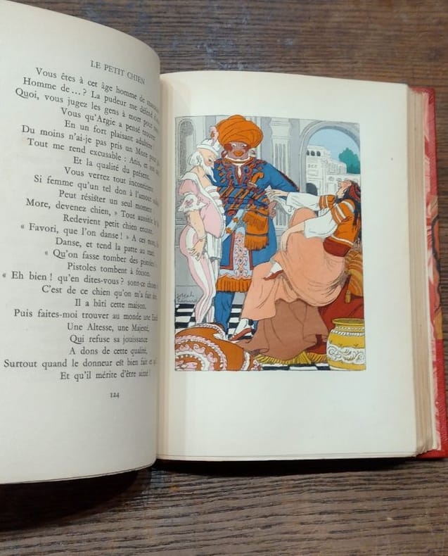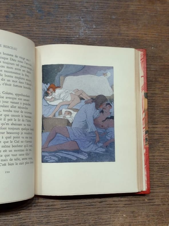 Paris L'Edition d'Art H. Piazza 1932 in 8 (19x13,5) 12 volumes reliures demi maroquin rouge à longs grains, et petits coins, dos à nerfs soulignés de filets dorés et ornés de très fins fleurons dorés, têtes dorées, couvertures illustrées en couleurs conservées. Avec de nombreux ornements décoratifs et 309 illustrations en couleurs dont 12 frontispices pleine page de André-E. Marty, gravés sur bois par E. Gasparini. Tome I: Poésies I - Contes d'Espagne et d'Italie; Poésies diverses. Tome II: Poésies II - Un spectacle dans un fauteuil; Poésies nouvelles. Tome III: Poésies III - Poésies nouvelles (suite et fin). Tome IV: Comédies et Proverbes I - André del Sarto; Lorenzaccio. Tome V: Comédies et Proverbes II - Les caprices de Marianne; Fantasio; On ne badine pas avec l'amour. Tome VI: Comédies et Proverbes III - La nuit vénitienne; Barberine; Le chandelier. Tome VII: Comédies et Proverbes IV - Il ne faut jurer de rien; Un caprice; Il faut qu'une porte soit ouverte ou fermée; Louison. Tome VIII: Comédies et Proverbes V - On ne saurait penser à tout; Carmosine; Bettine. Tome IX: Nouvelles et Contes I - Emmeline; Les deux maitresses; Frédéric et Bernerette. Tome X: Nouvelles et Contes II - Le fils du Titien; Margot; Croisilles; Pierre et Camille. Tome XI: Nouvelles et Contes III - Le secret de Javotte; Histoire d'un merle blanc; Mimi Pinson; La mouche. Tome XII: La confession d'un enfant du siècle. Tirage limité à 2250 exemplaires, celui-ci un des 200 exemplaires numérotés sur pur fil de Rives contenant une suite en noir des illustrations. Reliures non signées, mais attribuables à A. Valat (relieur à Montpellier). Superbe ensemble, très finement relié, ors rutilants ( Photographies sur demande / We can send pictures of this book on simple request )