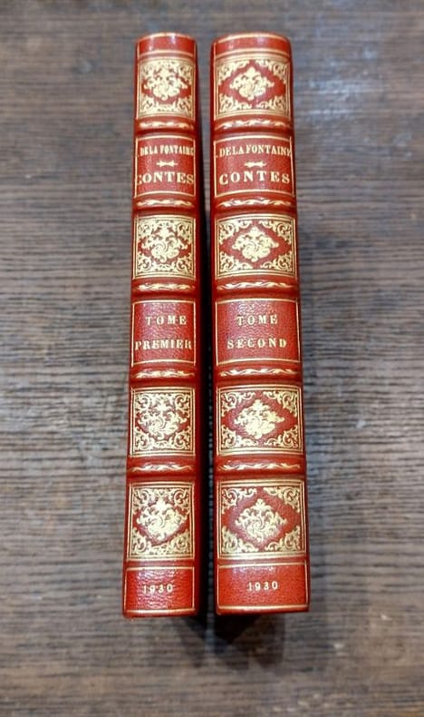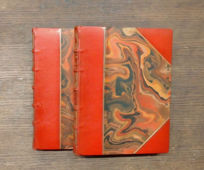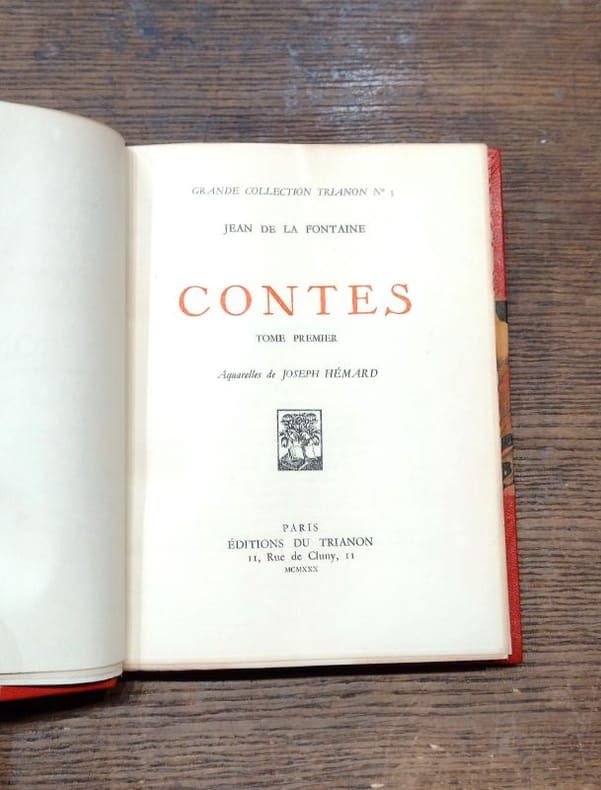 editions du trianon 1930 2 Paris, Editions du Trianon, 1930, 2 volumes de 165x220 mm environ, 241 et 348 pages, édition sur vélin pur fil du marais non numérotée, complet des 16 illustrations à pleine page de Joseph Hémard. Reliure signée de Guétant, demi maroquin rouge orangé à coins bordés de double filets dorés, dos à cinq nerfs portant titres et tomaisons dorés, caissons ornés, tranche de tête dorée, gardes marbrées, couvertures conservées. Coins frottés comme d'ordinaire, de légères griffures sur le papier marbré des plats, page de faux-titre du tome I dédicacée à l'encre par les amis du précédent possesseur de l'ouvrage, sinon bon état général, bel exemplaire.