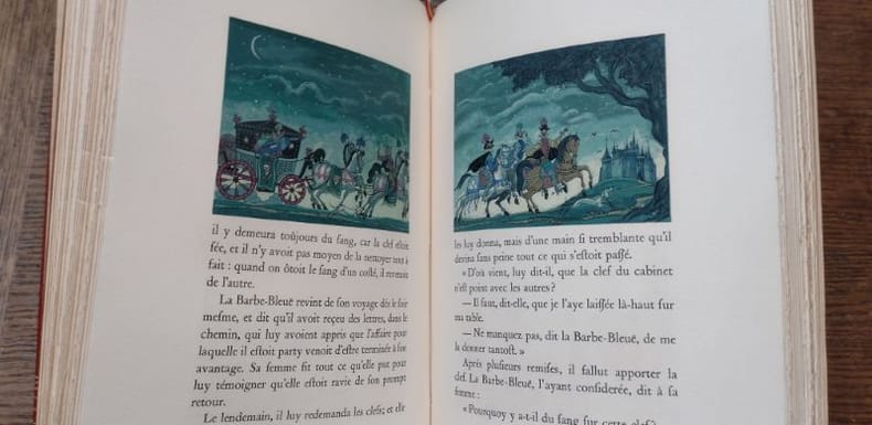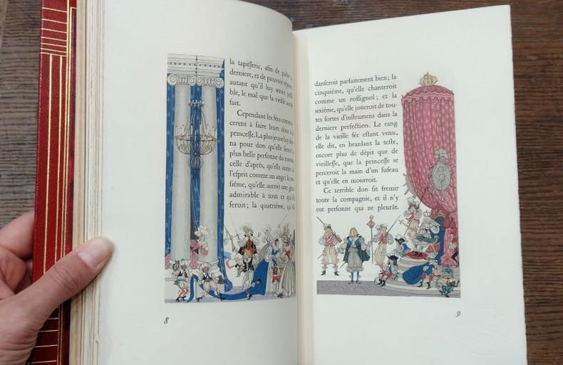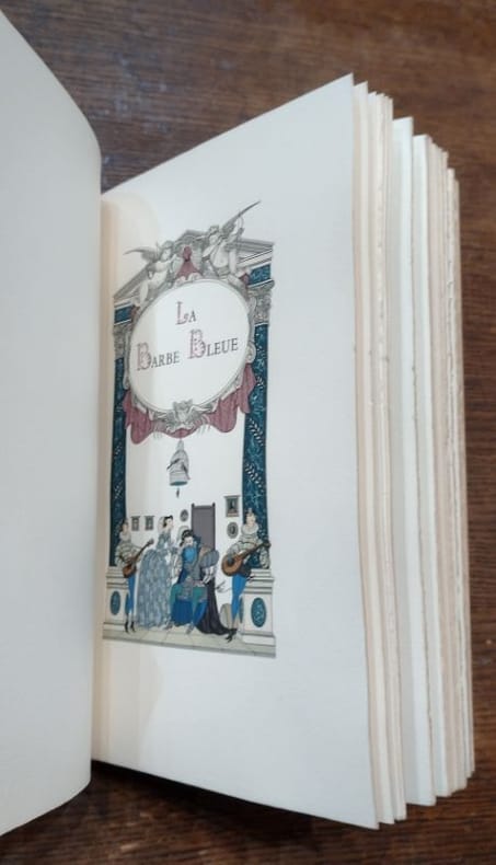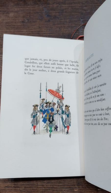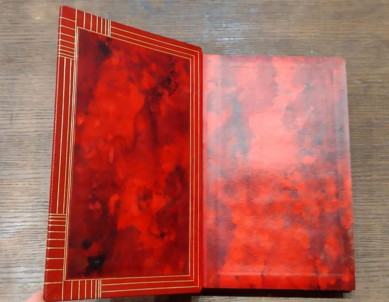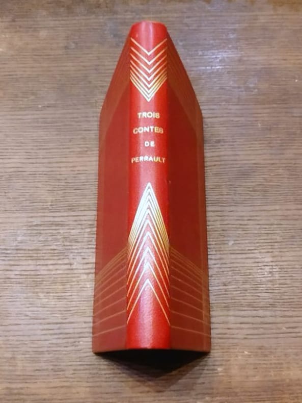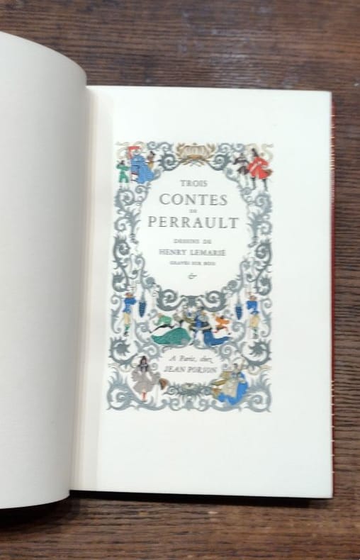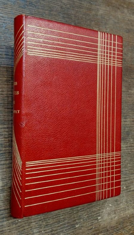Jean Porson 1948-1949-1950 A Paris, chez Jean Porson, 1948-1949-1950,1 volume in-8 de 155x240 mm environ, (2) ff., 41 pages, (3) ff.; 25 pages, (3) ff.; 35 pages, (4) ff. Un des exemplaires Hors Commerce, sur papier de Rives, numérotés de A à Z (L), complet des 110 illustrations de Henry Lemarié, gravées et imprimées en de multiples couleurs. Plein maroquin rouge, dos lisse portant titre doré et filets dorés au motif géométrique, suite de ce décor géométrique sur les plats (sorte de quadrillage doré), tranche de tête dorée, contreplats de papiers marbrés bordé de cuir rouge assorti et orné de filets dorés, couvertures conservées. Coiffes sensiblement frottées, un accroc sur le dos, sinon intérieur en très bon état, d'une grande fraîcheur, bel exemplaire.