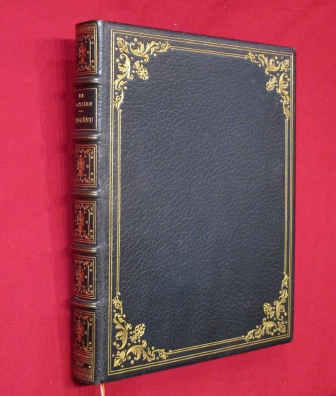 blaizot 1927 in-4 plein maroquin signé bernasconi goix Paris, Auguste Blaizot, 1927, 1 volume in-4 de 220x270 mm, 176 pages, (2)ff. (table des illustrations, justification du tirage gravée). Un des 300 exemplaires numérotés sur Velin de Rives, complet des illustrations à leau-forte par Bernard Naudin (en-têtes, culs-de-lampe, filigranes, planches). Belle reliure signée Bernasconi et Goix, plein maroquin bleu nuit, dos à cinq nerfs portant titres dorés et caissons richement ornés, deux filets dorés et beaux écoinçons inscrits dans un double encadrement sur les plats, toutes tranches dorées et double filet doré sur les coupes, bel encadrement des contreplats, gardes marbrées, couvertures conservées. Quelques frottements sur les coins et les coiffes, discrètes marques sur le plat inférieur et les mors, sinon intérieur frais, bon état, très bel exemplaire.