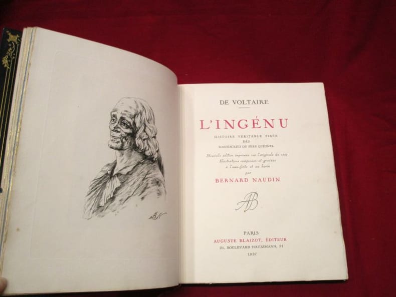 Rare édition à la date de l'originale qui manque au catalogue de la BnF à Bengesco et à Jones.L'ouvrage parut également sous le titre de "Le Huron et l'Ingénu."L'un des contes philosophiques les plus célèbres de Voltaire, véritable petit roman qui relate les "années d'apprentissage" d'un jeune Huron d'Amérique qui débarque en Bretagne dans la France de Louis XIV. Dénué de préjugés et ignorant des usages du pays, il rencontre lamour, affronte les Anglais et après ce combat héroïque, gagne Versailles pour recevoir la juste récompense de sa bravoure et obtenir la main de sa bien-aimée, mais il est arrêté et jeté en prison...Le conte répond aux thèses de Rousseau sur l'état de nature, traite du thème du bonheur rendu impossible par les conventions, la corruption et l'obscurantisme religieux et mène une charge vigoureuse contre l'absolutisme, les atteintes à la liberté individuelle, les jansénistes, les jésuites.L'ouvrage fut saisi quelques semaines après sa parution.(Manque à la BnF, à Bengesco et à Jones, 'L'ingénu', édition critique, Droz, 1957).Quelques rousseurs éparses.Bel exemplaire, frais, très bien relié en maroquin olive.