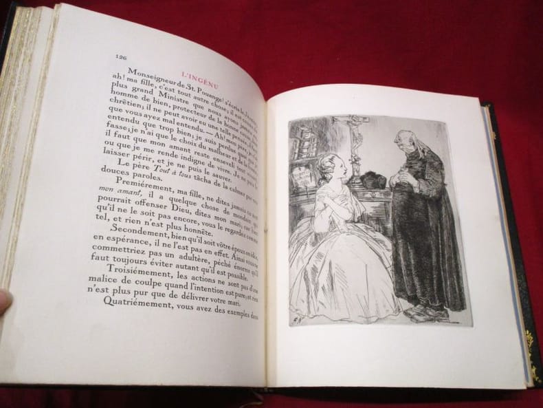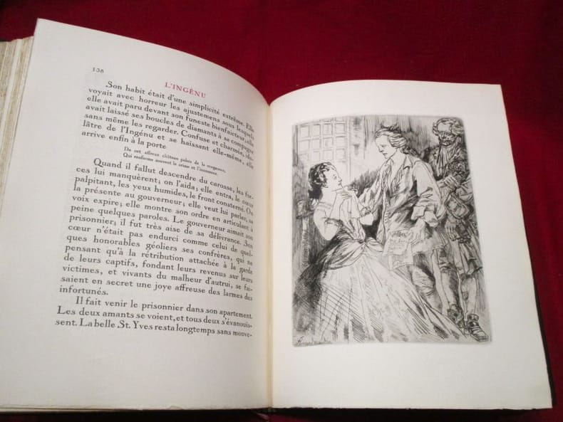 L'ingenu histoire veritable tiree des manuscrits du pere quesnel 1767 broché, ,26,5 x 20 cm, 110 pages, illustrée de 16 compositions en couleurs et 46 dessins en noir de Brunelleschi ; numeroté 1542/3000, etat superieur,