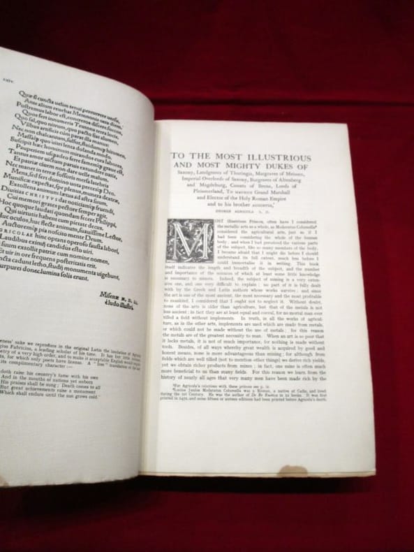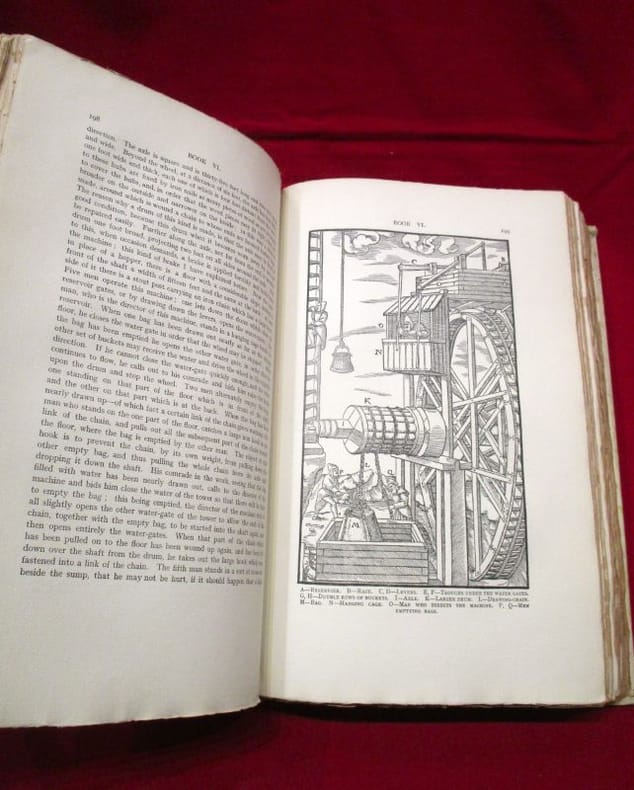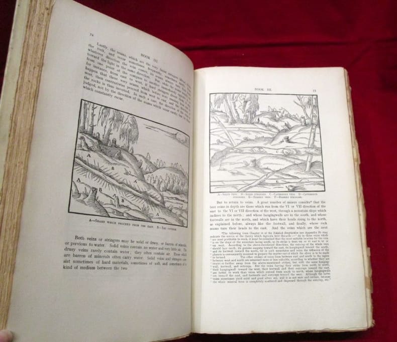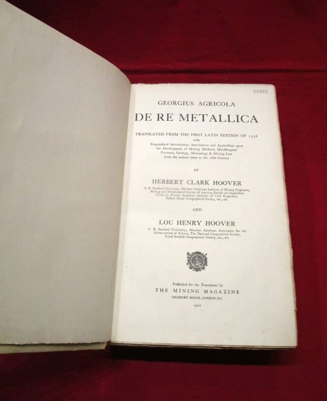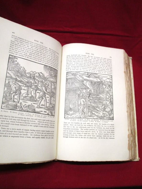 edition the mining magazine 1912. Reliure vélin moderne. Pages propres et non marquées. In-4 (22 cm X 35 cm), 637 pages, le livre est en tres bon etat, Introduction biographique, annotations et annexes sur le développement des méthodes minières, des procédés métallurgiques, de la géologie, de la minéralogie et du droit minier depuis les premiers temps jusqu'au XVIe siècle. Ce volume est la 1ère traduction anglaise du De Re Metallica, publié en privé par abonnement. Il a été traduit par le futur président Herbert Hoover, un ingénieur des mines, et son épouse, Lou Henry Hoover, un géologue et un érudit classique. Le contenu du livre est divisé en 12 livres: Livre I: Arguments pour et contre cet art; Livre II: Le mineur et un discours sur la découverte des veines; Livre III: Veines et limons et coutures dans les rochers; Livre IV: Délimiter les veines et les fonctions des agents miniers; Livre V: Le creusement du minerai et l'art de l'arpenteur; Livre VI: Les outils et les machines des mineurs; Livre VII: Sur le dosage du minerai; Livre VIII: Rôtissage, concassage et lavage des minerais; Livre IX: Méthodes de fusion des minerais; Livre X: Séparer l'argent de l'or et le plomb de l'or ou de l'argent; Livre XI: Séparer l'argent du cuivre; Livre XII: Fabrication du sel, de la soude, de l'alun, du vitriol, du soufre, du bitume et du verre. Photos possibles