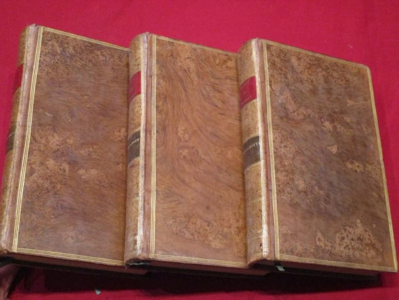 deterville De l'Imprimerie de P. Didot L'Ainé, A Paris, Chez Deterville, An VII (1799), 3 volumes in-8 de 120x195 mm environ, XVJ, 366 - 414 - 418 pages. Plein veau raciné, dos lisses portant titres et tomaisons dorés sur pièce de cuir respectivement rouge et brun, fers dorés, filet doré sur les coupes, gardes marbrées. Menus frottements habituels sur les coupes et coins, rares rousseurs et quelques feuillets brunis sinon intérieur très frais, bon état, bel ensemble.