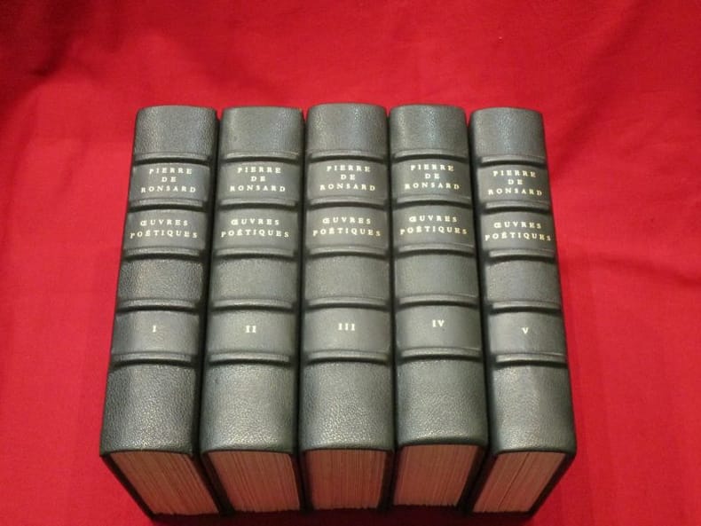 1978 Bibliothèque française de la Nouvelle librairie de France, 1978-1979, 5 volumes de 155x210 mm et environ 450 pages chacun, un des 1500 exemplaires sur vergé des Charentes. Pleine reliure chagrinée vert sapin, dos à cinq nerfs portant titres et tomaisons dorés, tranches de tête dorées, gardes marbrées. Discrète griffure sur le plat inférieur du tome deux, petits frottements sur les coins, sinon bon état.