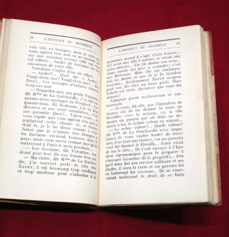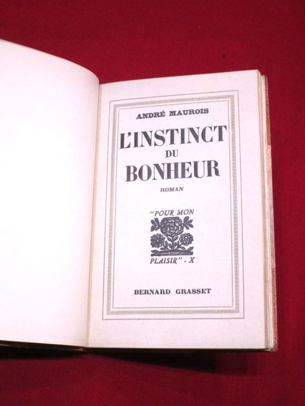 André Maurois, pseudonyme d’Émile Salomon Wilhelm Herzog, né le 26 juillet 1885 à Elbeuf et mort le 9 octobre 1967 à Neuilly-sur-Seine, est un romancier, biographe, conteur et essayiste français. « Joli couple », a dit Madame de la Guichardie en regardant Colette Romilly et André de Saviniac courir bras dessus bras dessous vers les tennis. Et le petit cercle sur qui elle règne dans ce coin de Périgord a compris qu'elle songe à les marier. Nulle union ne serait mieux assortie. Alors pourquoi les parents de Colette accueillent-ils avec désarroi le projet de leur amie? lis finissent par s'en ouvrir à elle. Leur secret risque de peser sur l’avenir de Colette. C'est celui d'une bataille perdue contre les préjugés des Romilly, puissants industriels de Pont-de-l'Eure. Comment réagiront Colette et André? Première surprise : les jeunes « savent » déjà. Le silence de ses aînés a seulement retenu Colette de leur en parler. En se taisant sur les sujets brûlants, en gardant pour soi ce qui pouvait ébranler leur paix, ils ont obéi les uns et les autres à l'instinct de conservation, l'instinct du bonheur. C'est aussi avec un dosage de paroles et de silences que Madame de la Guichardie manœuvre les Saviniac. Stratégie nécessaire dans ces milieux de province si bien décrits ici où, sous la surface du rigorisme, bout le courant des préjugés, des haines et des passions. volume in8, 18x13, relié demi veau, 236pp, bien frais, bel exemplaire! Paris, Grasset, 1934 d'autres vols. de André Maurois dans la même reliure, groupez les achats ! ref/133