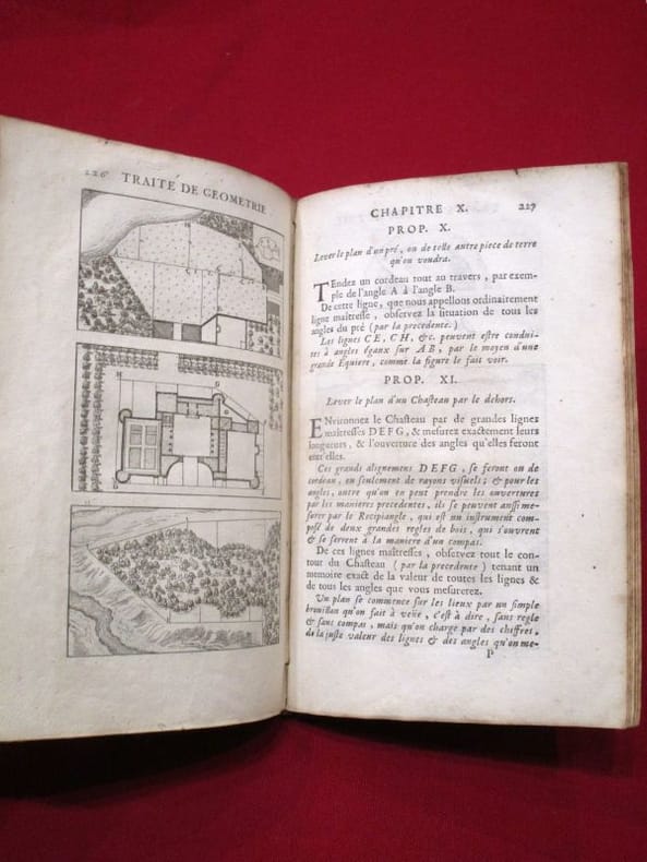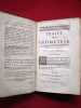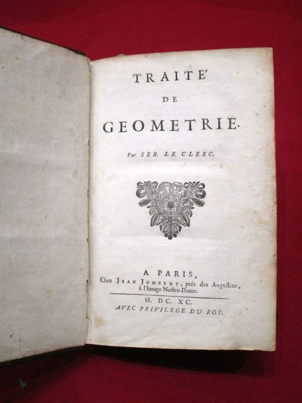Paris, Jean Jombert, 1690, in-8, [4]-229 pp, veau moucheté havane, dos à nerfs orné de caissons dorés, pièce de titre rouge, Édition originale de ce traité de géométrie du célèbre graveur Sébastien Leclerc. Il est illustré de nombreux schémas géométriques gravés sur bois et 15 vignettes à pleine page gravées sur cuivre, tous dans le texte. Les neuf premiers chapitres traitent des notions fondamentales de la géométrie euclidienne et le dernier, intitulé "Pratique sur le terrain" aborde la levée de plan, la mesure d'objets inaccessible (comme la largeur d'une rivière ou l'angle d'un fossé plein d'eau). Il est orné de vignettes plus élaborées représentant les propositions qui le composent. Sébastien Leclerc a publié un premier traité intitulé Pratique de la géométrie en 1669 dans un petit format mais souhaitait en faire un plus complet et étendu en rédigeant celui-ci. Sébastien Leclerc, ou Le Clerc (1637-1714), fut tour à tour, ingénieur-géographe, membre de l'Académie Royale de peinture, graveur du Cabinet de Louis XIV et professeur à l'École des Gobelins. Ses recherches sur la perspective et la géométrie le conduiront à enseigner ces matières à l'Académie royale, entre 1680 et 1699. JOMBERT, Catalogue raisonné de l'oeuvre de Sébastien Le Clerc, 1774, vol. II, n°229. Reliure un peu défraîchie mais solide, frontispice manquant, galerie de ver sans atteinte. Couverture rigide