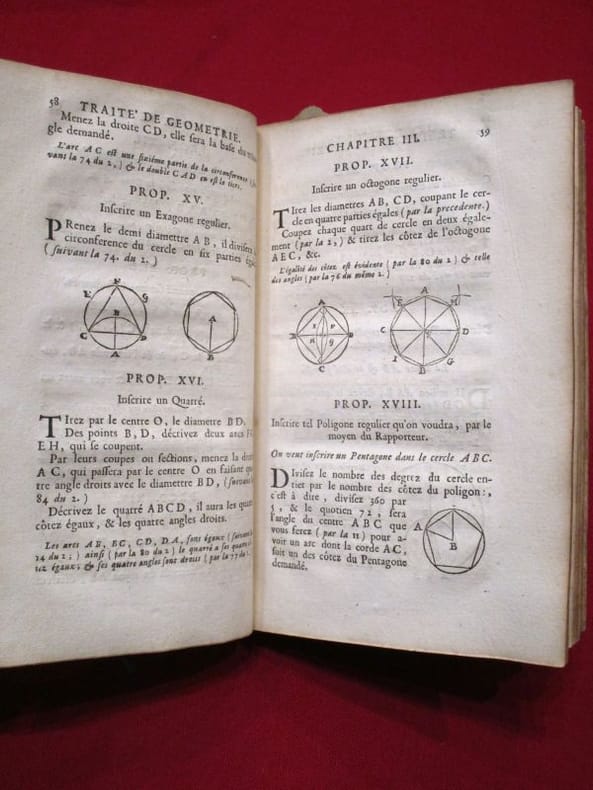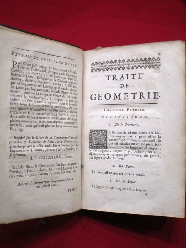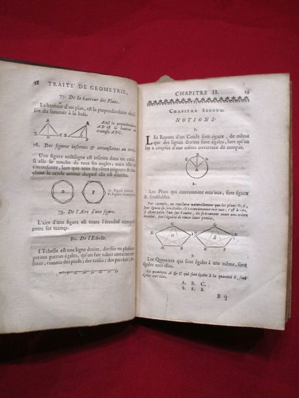 1735 Paris, David, 1735 ; in-12 , 16 x 10 cm, 5 f.n.ch., 503 pp. Plein veau d'époque, dos à nerfs orné et pièce de titre. Bel exemplaire complet de ce traité de géométrie, d'algèbre et d'arithmétique agrémenté de gravures sur bois dans le texte.