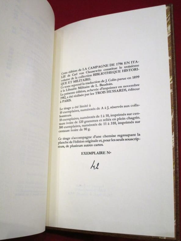 Aux Trois Hussards 1982 Aux Trois Hussards, 1982, un volume de texte de 339 pages + une chemise contenant les cartes, l'ensemble in-8 de 145x230 mm environ, sous coffret. Tirage numéroté à 320 exemplaires, édition augmentée de cartes réservées aux souscripteurs de cette édition, complet des 7 cartes. Texte dans un volume avec reliure éditeur en skivertex, pochette assortie reliée en skivertex doublée de suédine. Des frottements sur le coffret sinon bon état.