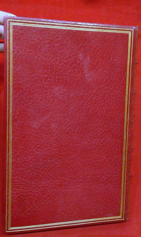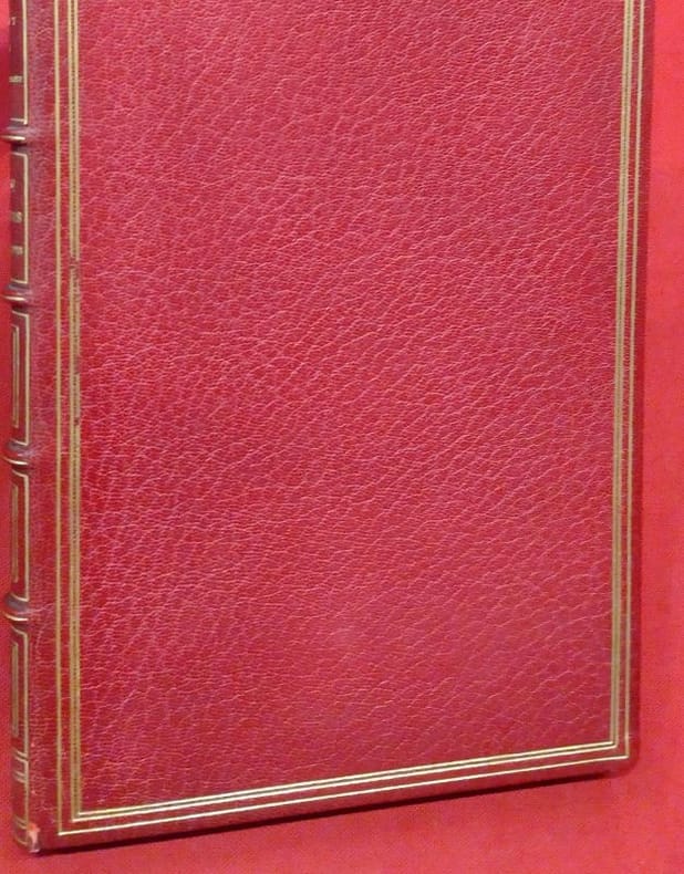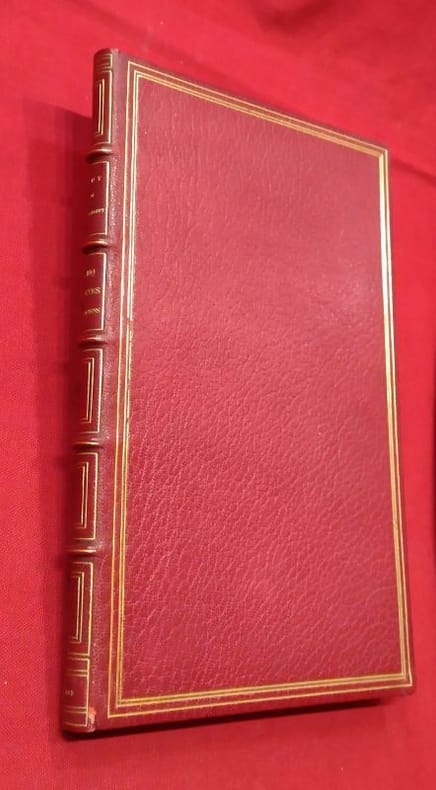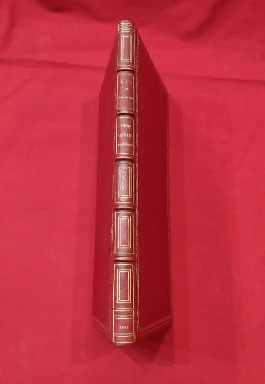 Pour les cent bibliophiles 1905 plein maroquin Paris, Pour les cent bibliophiles, 1905, 1 volume grand in-8 de 180x285 mm environ, 97 pages, (2) ff. (table, achevé d'imprimé), tirage à 130 exemplaires numérotés, exemplaire nominatif, sur papier japon. Complet du frontispice et des cinq eaux-fortes à pleine page, nombreuses eaux fortes in-texte. Reliure signée de Salvador David, plein maroquin rouge, dos à cinq nerfs portant titres et date dorés, triple encadrement sur les plats, tranche de tête dorée, double filet doré sur les coupes, belle frise dorée sur les chasses, gardes marbrées, couvertures et dos d'origine. Menus frottements sur les mors, léger effacement des filets d'encadrement du premier plat (quelques millimètres), coins inférieurs légèrement courbés, sinon très bel exemplaire, bon état général.