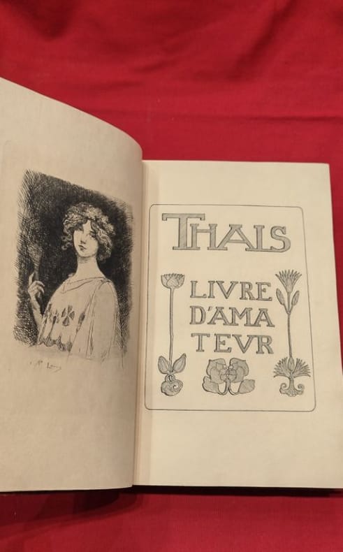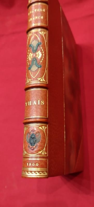 Paphnuce est un abbé d'un groupe de moines cénobites égyptiens fondamentalistes (IVe siècle après J-C). Il s'est retiré dans le désert pour se repentir de sa jeunesse frivole. Après des années de vie monacale, une vision le pousse à revenir sur les lieux de son adolescence. Illuminé, il se donne pour mission de "sauver l'âme" de Thaïs, courtisane de la ville d'Alexandrie, célèbre pour les qualités de son esprit autant que pour sa beauté éblouissante. Paphnuce va parvenir à convaincre la belle Thaïs de rejoindre la vie religieuse afin de trouver le chemin du Ciel et la vie éternelle. Cependant, Paphnuce tombe éperdument amoureux et dès lors, il est dévoré par la jalousie sexuelle en imaginant tous les hommes que Thaïs a accueillis dans son lit. Toute une vie de prières et d'ascétisme, ne réussira pas à éteindre le feu que la seule vue de Thaïs a engendré dans son coeur. Il finira par renier Dieu en recueillant le dernier souffle de Thaïs. volume in-8 180x120, joliment relié, en excellent état, Paris Calman Levy 1928/1930 ref/263