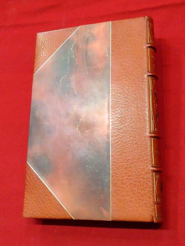 A. romagnol, dix 1900 art déco, aussourd Paris, Librairie de la Collection des dix, A. Romagnol, 1900, 1 volume in-4 de 170x275 mm environ, frontispice, (2) ff. (faux-titres), page de titre, 240 pages, (1) f. Exemplaire sur papier Japon, complet du frontispice et des 7 hors-texte. Il manque la page de justification du tirage et notre exemplaire ne contient pas les trois états des illustrations normalement présent dans les 20 exemplaires sur papier Japon. Élégante reliure au dos mosaïqué, d'inspiration Art déco, signée par René Aussourd. Demi-maroquin à coins orangé dans son étui bordé assorti, dos à quatre nerfs portant titres dorés, caissons de tête et de queue ornés d'un scarabée noir et vert, papyrus stylisés dans les tons crème et vert dans une composition au centre du dos, fers floraux dorés, tranche de tête dorée, gardes marbrées. Un petit frottement sur une aile de scarabée, sinon très bel exemplaire, bon état.