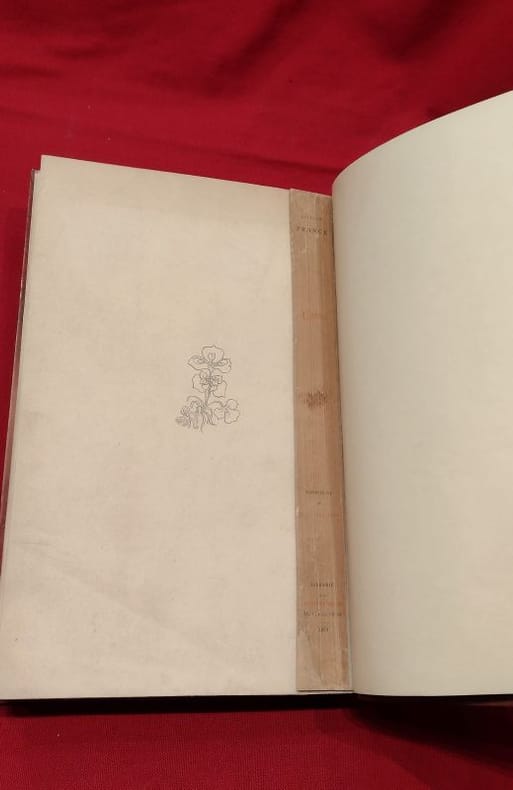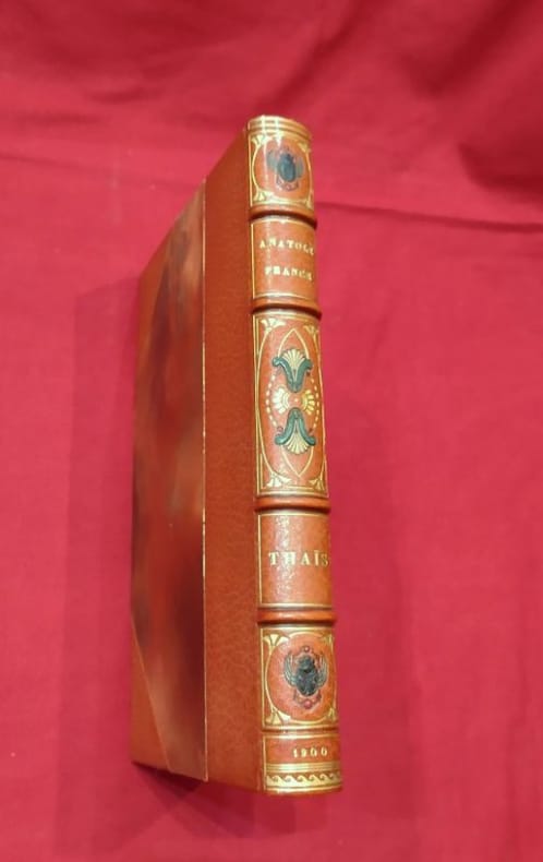 « Que le conte et la nouvelle est de meilleur goût [que le roman] ! Que c'est un moyen délicat de plaire aux gens d'esprit ! [...] La première politesse de l'écrivain, n'est-ce point d'être bref ? La nouvelle suffit à tout. » (Anatole France, La Vie littéraire, t. IV). France ne se défit jamais de ce goût pour les récits courts et commença ainsi sa carrière après quelques recueil de poèmes. Il y voyait là un moyen efficace de transmettre ses idées et sa philosophie des choses Le manuscrit d’un des titres les plus célèbres de France, Thaïs, fut rédigé sur le papier à en tête du Sénat où Anatole France est en poste. La publication en feuilletons dans la Revue des Deux mondes est gérée par Leontine de Caillavet (1er et 15, 1er août 1889) sous le titre définitif de Thaïs. «Le succès fut retentissant et il redoubla d’ampleur, lors de la publication en volume, au mois d’octobre 1890. Brusquement le nom d’Anatole France se répandit dans le grand public : il devint un auteur célèbre et se vit placé sur le même pied que les principaux chefs de file, les Zola, les Maupassant, les Daudet, les Loti, les Bourget qui l’avaient précédé sur la route de la gloire […]». Thaïs connaîtra deux éditions illustrées, l'une par P.-Albert Laurens en 1900 aux éditions Romagnol, l'autre par Rochegrosse en 1909 chez Ferroud. Charmantes reliures uniformes de Visinand pour les deux premiers recueils de nouvelles d'Anatole France et son célèbre Thaïs.